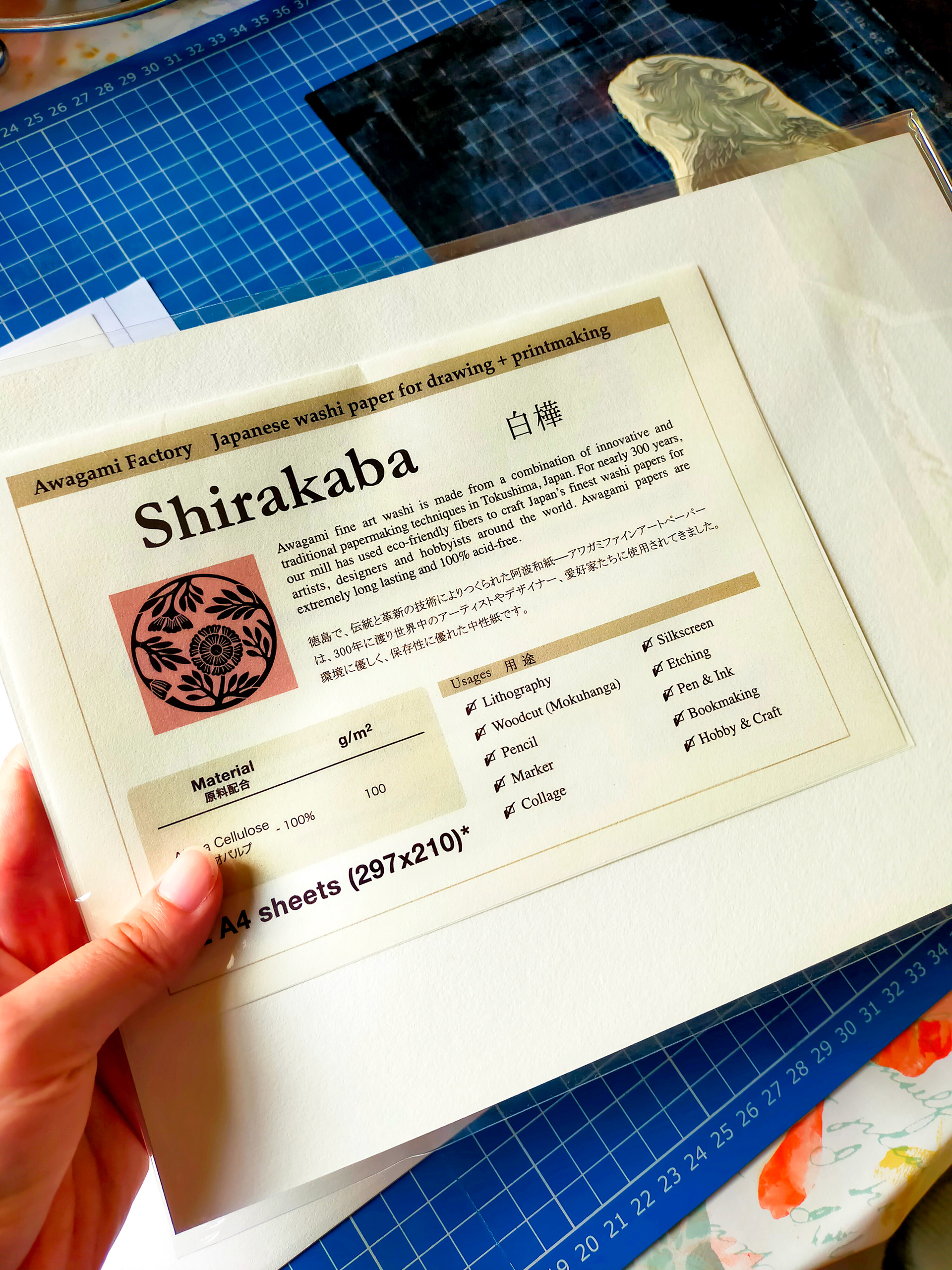 Plaque au format A5, imprimée à la main sur papier Shirakaba, avec encre Caligo safe wash.